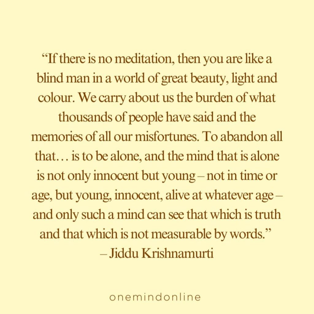 “If there is no meditation, then you are like a blind man in a world of great beauty, light and colour. We carry about us the burden of what thousands of people have said and the memories of all our misfortunes. To abandon all that… is to be alone, and the mind that is alone is not only innocent but young – not in time or age, but young, innocent, alive at whatever age – and only such a mind can see that which is truth and that which is not measurable by words.” – Jiddu Krishnamurti