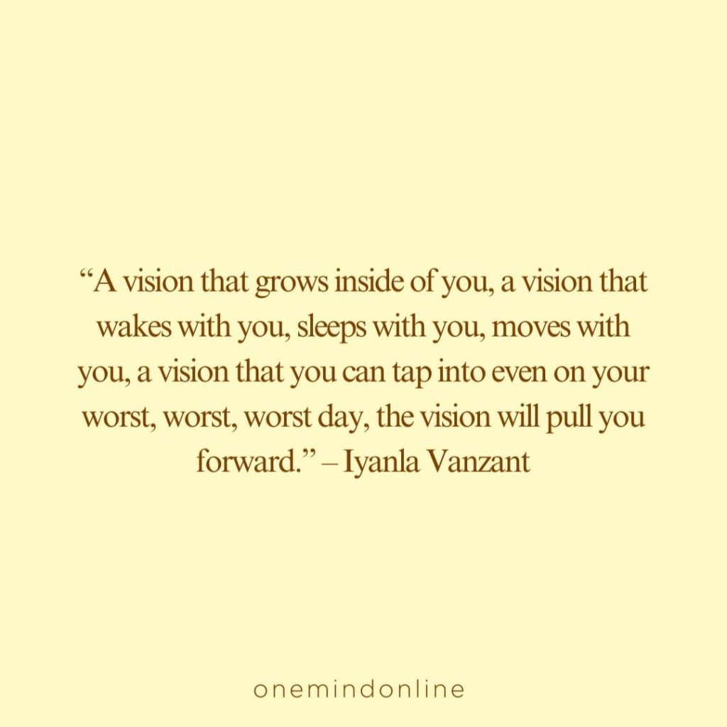 “A vision that grows inside of you, a vision that wakes with you, sleeps with you, moves with you, a vision that you can tap into even on your worst, worst, worst day, the vision will pull you forward.” – Iyanla Vanzant