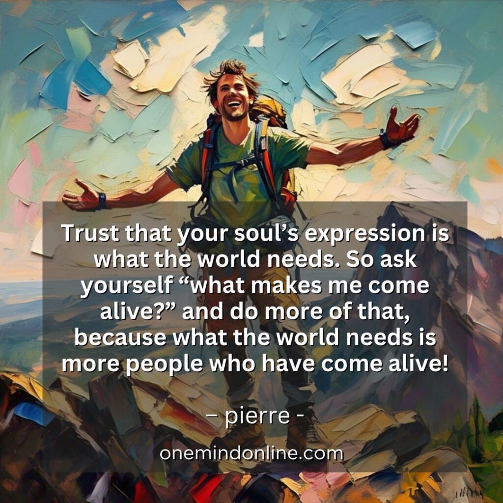 Where your greatest joy meets the world’s need… THAT is where your purpose lies! But don’t get stuck in asking “what does the world need?” instead trust that your soul’s expression is what the world needs. So ask yourself “what makes me come alive?” and do more of that, because what the world needs is more people who have come alive!