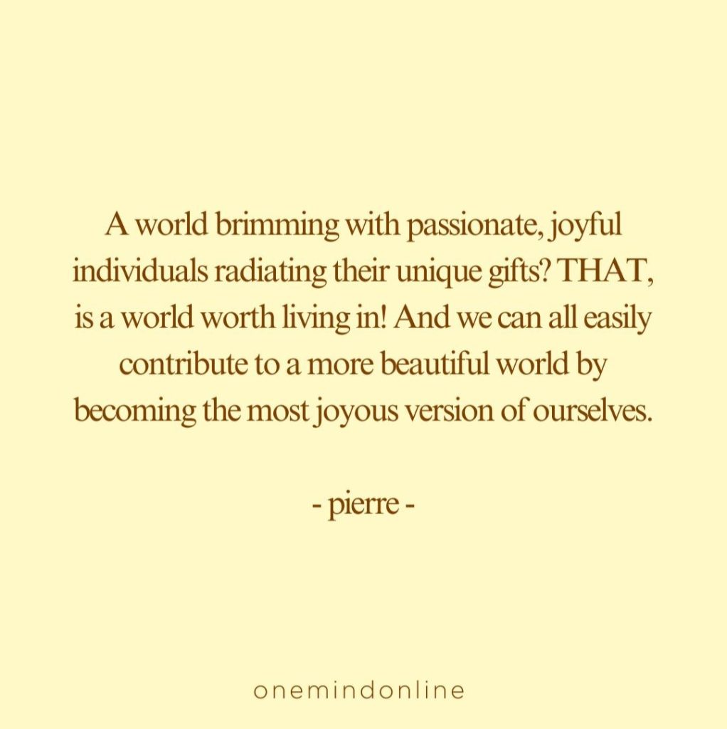 A world brimming with passionate, joyful individuals radiating their unique gifts? THAT, is a world worth living in! And we can all easily contribute to a more beautiful world by becoming the most joyous version of ourselves.