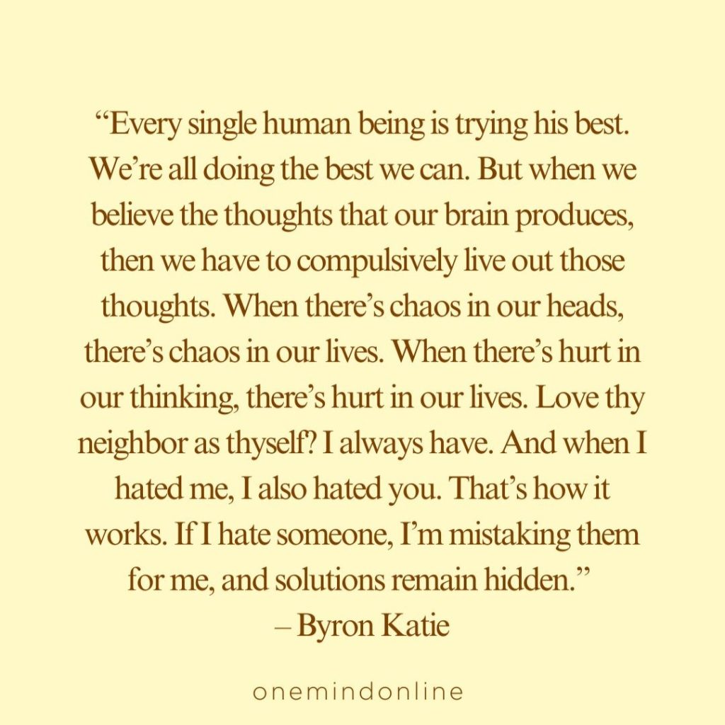 “Every single human being is trying his best. We’re all doing the best we can. But when we believe the thoughts that our brain produces, then we have to compulsively live out those thoughts. When there’s chaos in our heads, there’s chaos in our lives. When there’s hurt in our thinking, there’s hurt in our lives. Love thy neighbor as thyself? I always have. And when I hated me, I also hated you. That’s how it works. If I hate someone, I’m mistaking them for me, and solutions remain hidden.” – Byron Katie