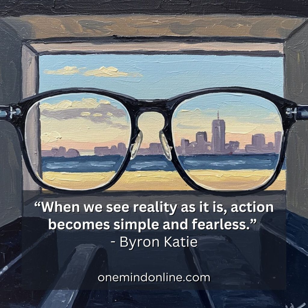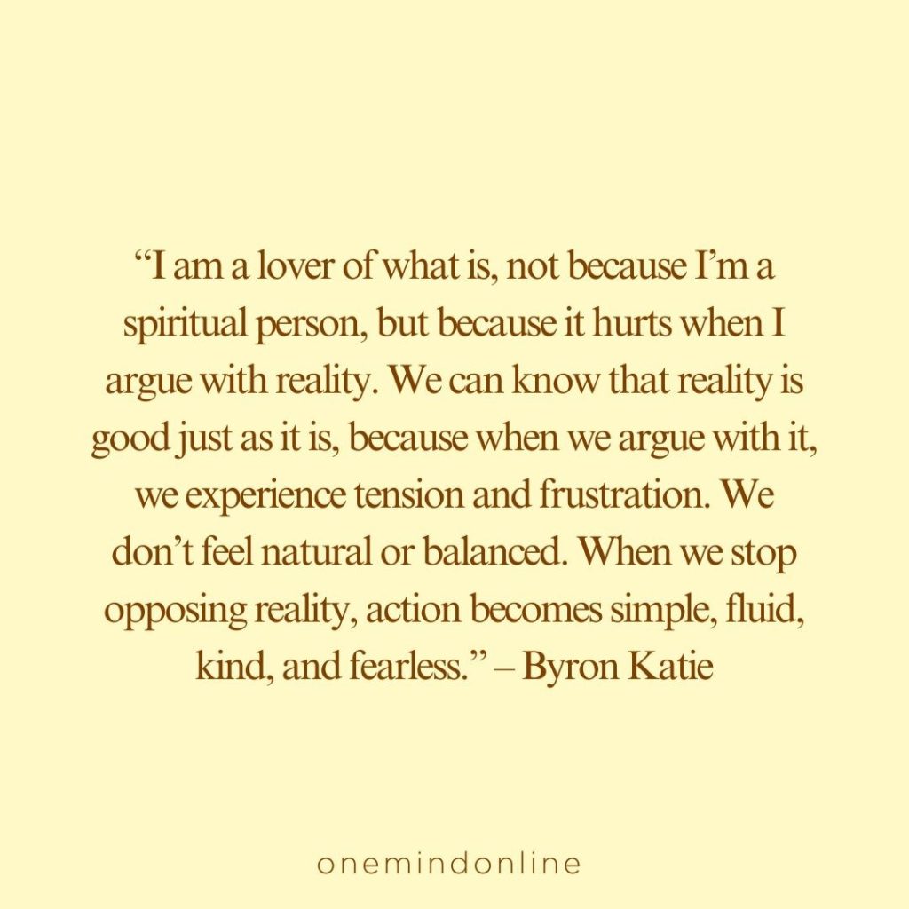 “I am a lover of what is, not because I’m a spiritual person, but because it hurts when I argue with reality. We can know that reality is good just as it is, because when we argue with it, we experience tension and frustration. We don’t feel natural or balanced. When we stop opposing reality, action becomes simple, fluid, kind, and fearless.” – Byron Katie