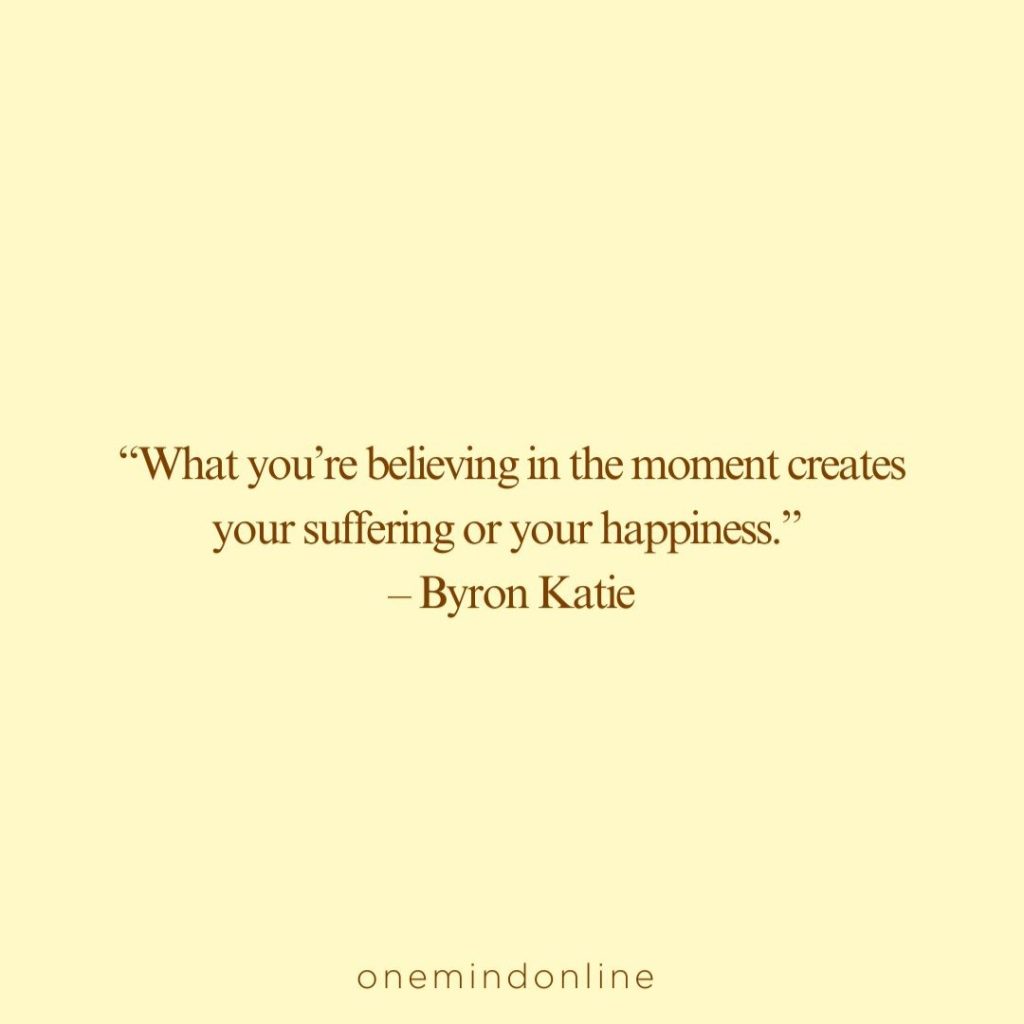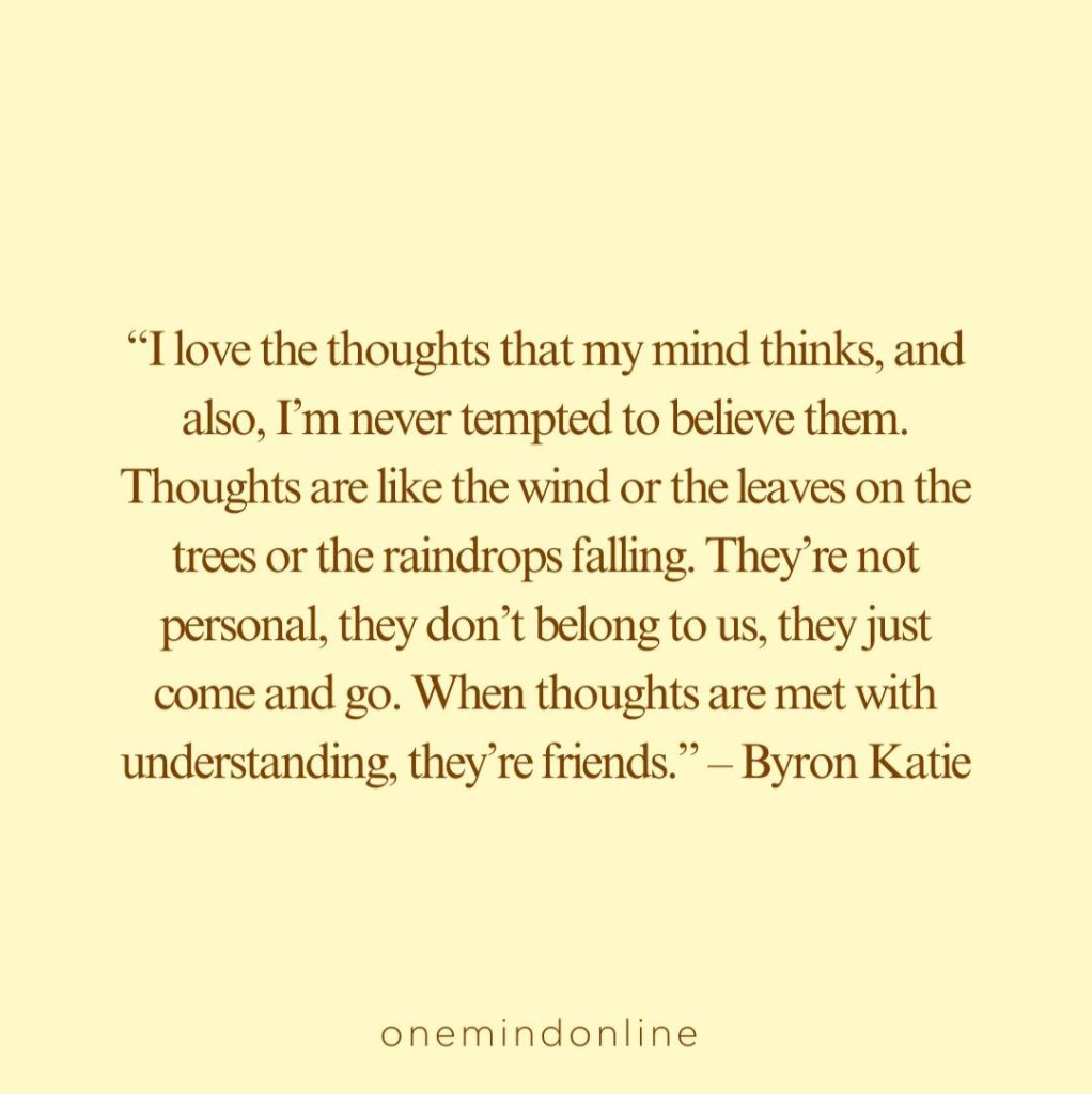 “I love the thoughts that my mind thinks, and also, I’m never tempted to believe them. Thoughts are like the wind or the leaves on the trees or the raindrops falling. They’re not personal, they don’t belong to us, they just come and go. When thoughts are met with understanding, they’re friends.” – Byron Katie