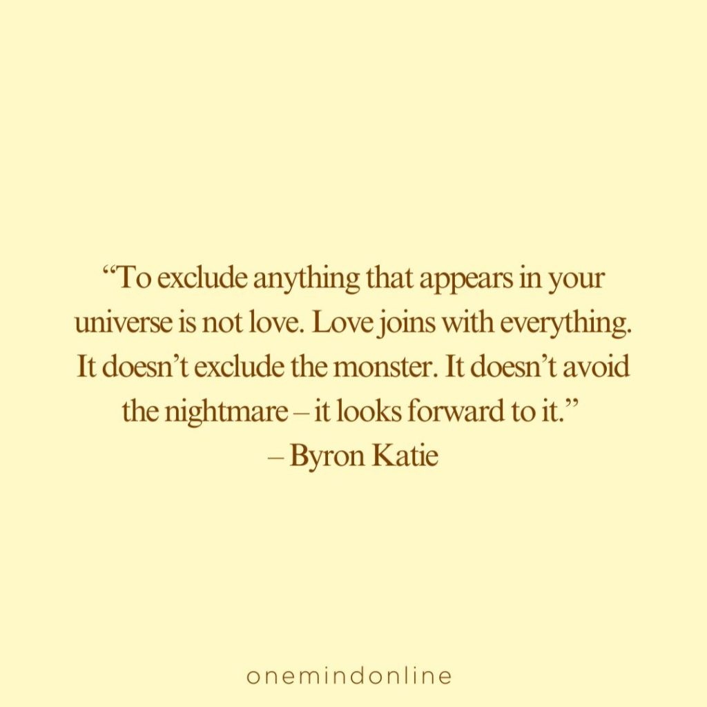 “To exclude anything that appears in your universe is not love. Love joins with everything. It doesn’t exclude the monster. It doesn’t avoid the nightmare – it looks forward to it.” – Byron Katie