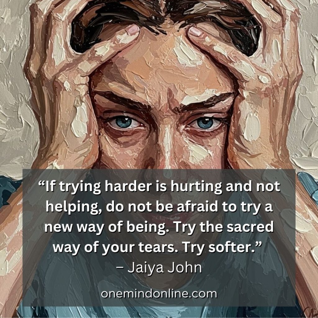 Trying softer means releasing the frantic, desperate energy behind your efforts and replacing it with intentional gentleness. It’s not about giving up or reducing your commitment, but about changing the quality of energy you bring to your goals. When you try harder with rigid force, you often create resistance. Trying softer is about allowing yourself to be fully human—to acknowledge your imperfections, to honor your emotions, and to give yourself permission to rest when you need it. As Jaiya John beautifully puts it, sometimes we need to “try the sacred way of your tears”—recognizing that vulnerability, emotional expression, and self-compassion aren’t signs of weakness but pathways to authentic strength. It means treating yourself the way you would treat someone you deeply care about: with patience, understanding, and grace.