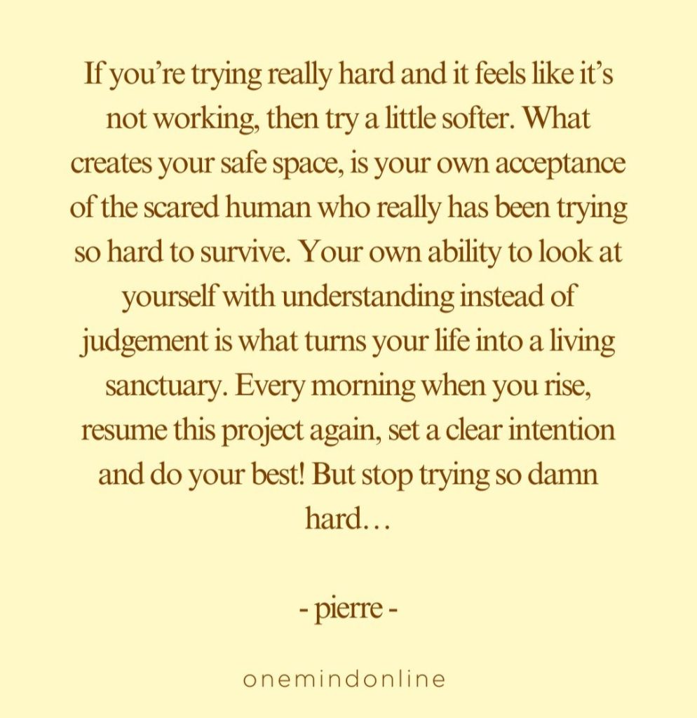 If you’re trying really hard and it feels like it’s not working, then try a little softer. What creates your safe space, is your own acceptance of the scared human who really has been trying so hard to survive. Your own ability to look at yourself with understanding instead of judgement is what turns your life into a living sanctuary. Every morning when you rise, resume this project again, set a clear intention and do your best! But stop trying so damn hard…