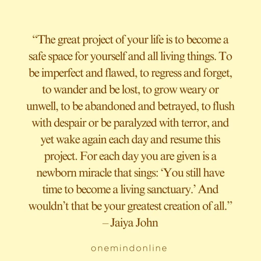 “The great project of your life is to become a safe space for yourself and all living things. To be imperfect and flawed, to regress and forget, to wander and be lost, to grow weary or unwell, to be abandoned and betrayed, to flush with despair or be paralyzed with terror, and yet wake again each day and resume this project. For each day you are given is a newborn miracle that sings: ‘You still have time to become a living sanctuary.’ And wouldn’t that be your greatest creation of all.” – Jaiya John