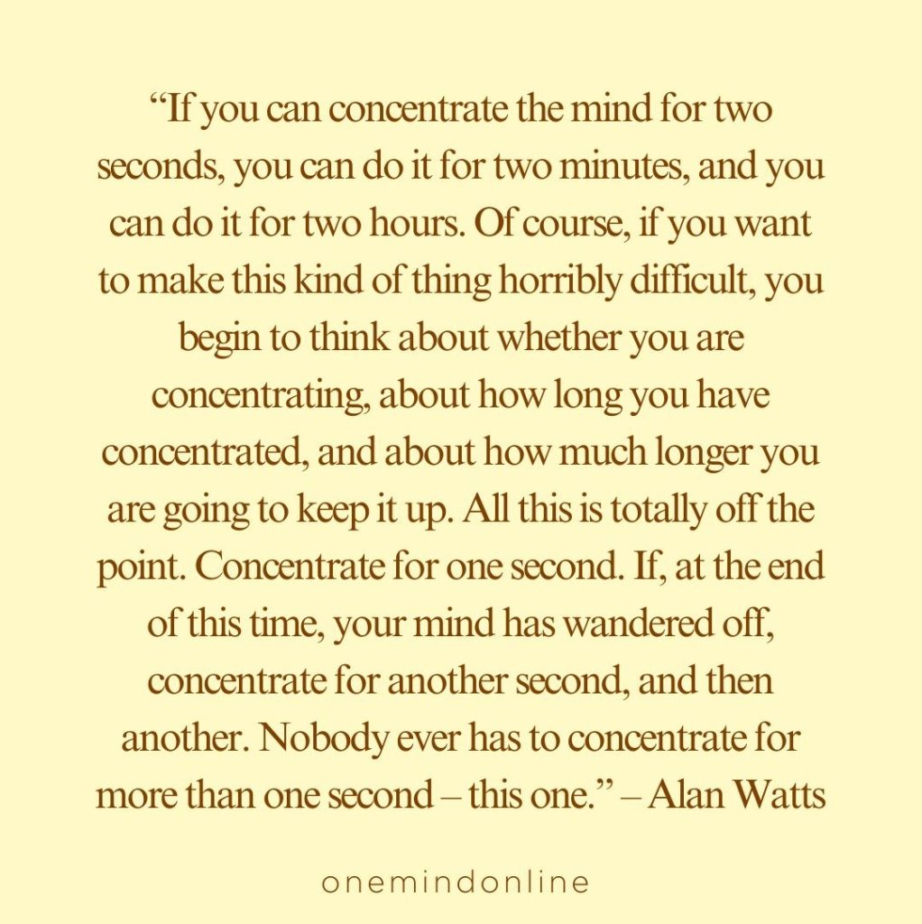 “If you can concentrate the mind for two seconds, you can do it for two minutes, and you can do it for two hours. Of course, if you want to make this kind of thing horribly difficult, you begin to think about whether you are concentrating, about how long you have concentrated, and about how much longer you are going to keep it up. All this is totally off the point. Concentrate for one second. If, at the end of this time, your mind has wandered off, concentrate for another second, and then another. Nobody ever has to concentrate for more than one second – this one.” – Alan Watts