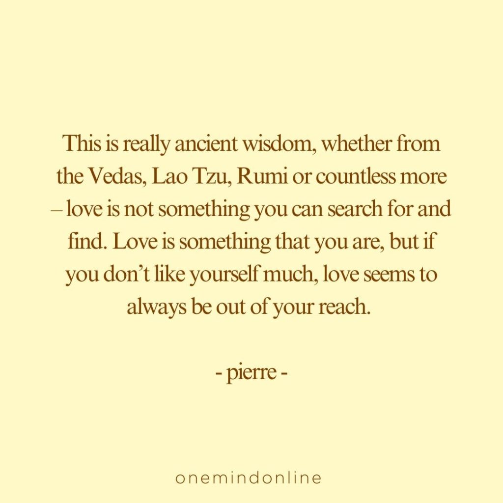 This is really ancient wisdom, whether from the Vedas, Lao Tzu, Rumi or countless more – love is not something you can search for and find. Love is something that you are, but if you don’t like yourself much, love seems to always be out of your reach.