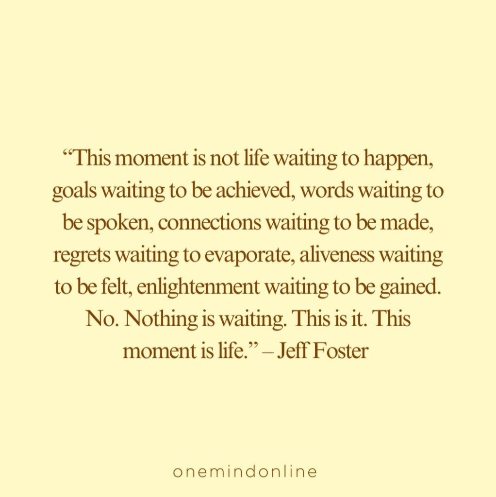 “This moment is not life waiting to happen, goals waiting to be achieved, words waiting to be spoken, connections waiting to be made, regrets waiting to evaporate, aliveness waiting to be felt, enlightenment waiting to be gained. No. Nothing is waiting. This is it. This moment is life.” – Jeff Foster