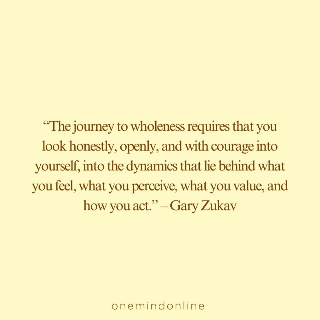 “The journey to wholeness requires that you look honestly, openly, and with courage into yourself, into the dynamics that lie behind what you feel, what you perceive, what you value, and how you act.” – Gary Zukav
