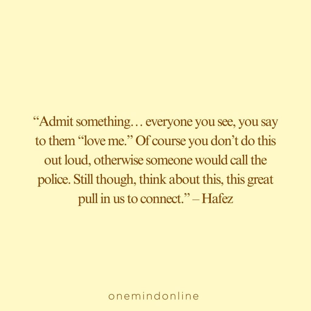 “Admit something… everyone you see, you say to them “love me.” Of course you don’t do this out loud, otherwise someone would call the police. Still though, think about this, this great pull in us to connect.” – Hafez