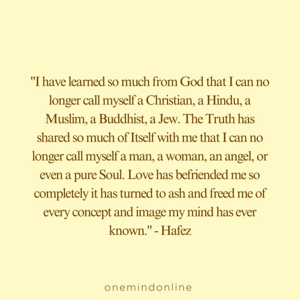 “I have learned so much from God that I can no longer call myself a Christian, a Hindu, a Muslim, a Buddhist, a Jew. The Truth has shared so much of Itself with me that I can no longer call myself a man, a woman, an angel, or even a pure Soul. Love has befriended me so completely it has turned to ash and freed me of every concept and image my mind has ever known.” – Hafez