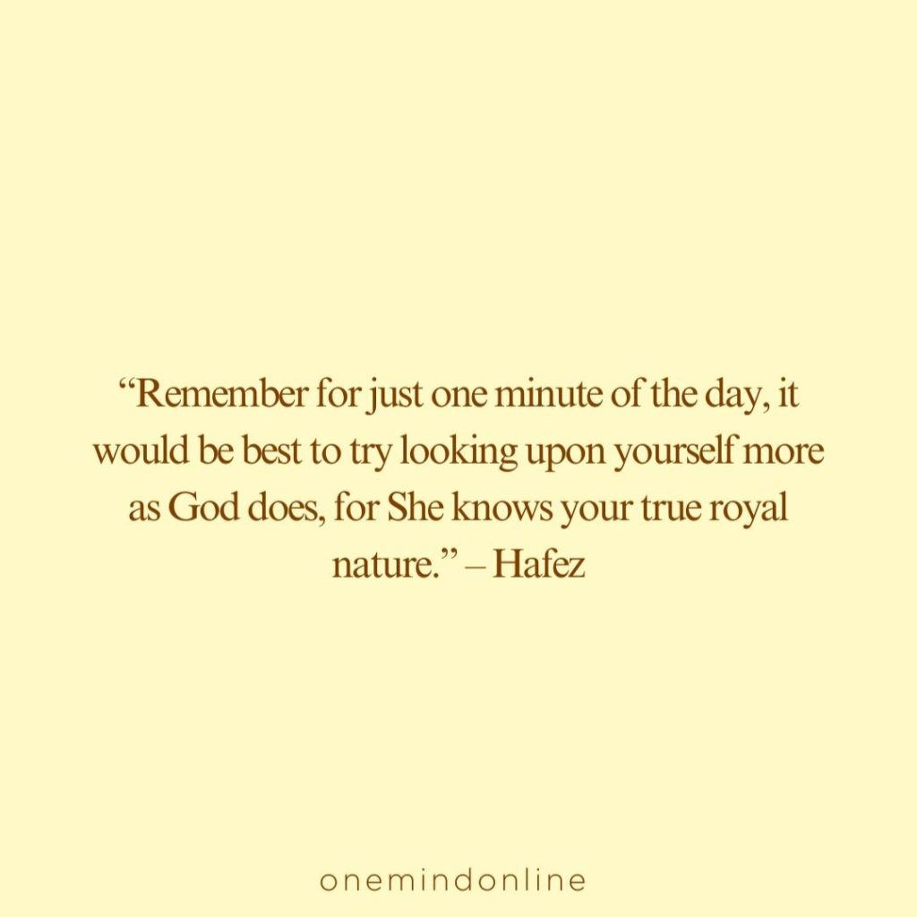 “Remember for just one minute of the day, it would be best to try looking upon yourself more as God does, for She knows your true royal nature.” – Hafez
