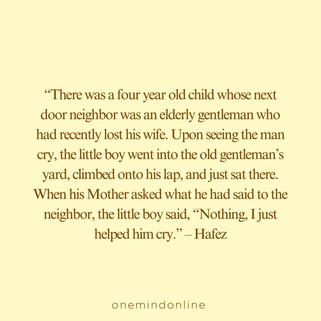 “There was a four year old child whose next door neighbor was an elderly gentleman who had recently lost his wife. Upon seeing the man cry, the little boy went into the old gentleman’s yard, climbed onto his lap, and just sat there. When his Mother asked what he had said to the neighbor, the little boy said, “Nothing, I just helped him cry.” – Hafez