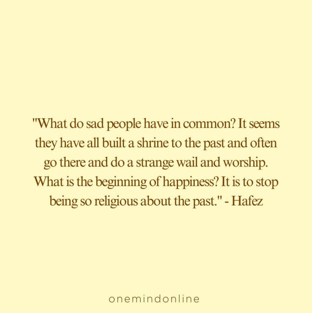 “What do sad people have in common? It seems they have all built a shrine to the past and often go there and do a strange wail and worship. What is the beginning of happiness? It is to stop being so religious about the past.” – Hafez