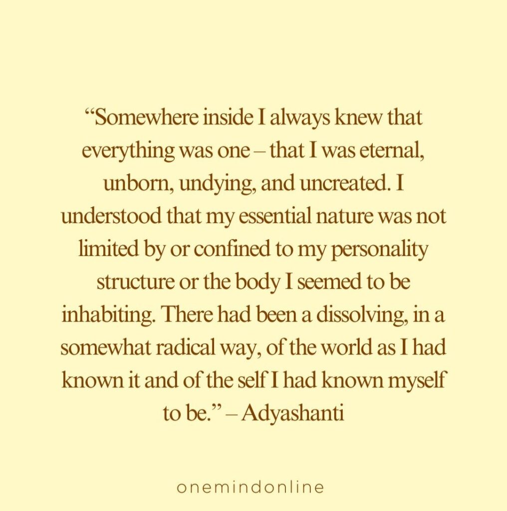 “Somewhere inside I always knew that everything was one – that I was eternal, unborn, undying, and uncreated. I understood that my essential nature was not limited by or confined to my personality structure or the body I seemed to be inhabiting. There had been a dissolving, in a somewhat radical way, of the world as I had known it and of the self I had known myself to be.” – Adyashanti