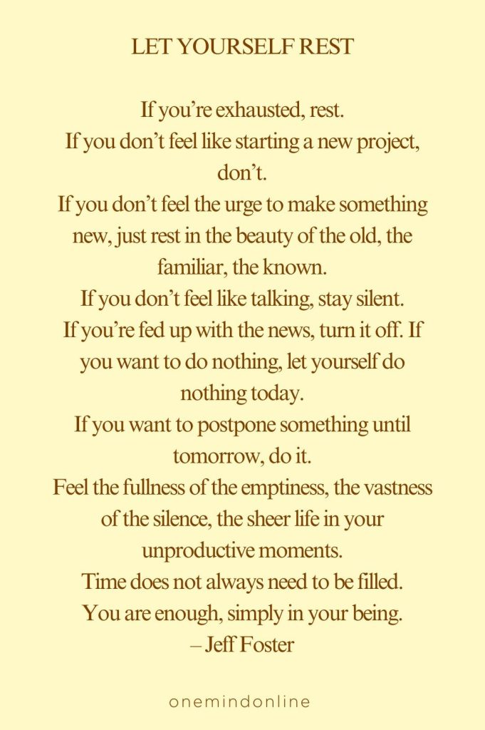 The piece I’m sharing from Jeff Foster today doesn’t cover this whole balancing act, but it speaks to the over emphasis the world places on non-stop action by reminding us to rest: