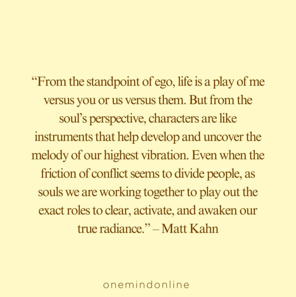 “From the standpoint of ego, life is a play of me versus you or us versus them. But from the soul’s perspective, characters are like instruments that help develop and uncover the melody of our highest vibration. Even when the friction of conflict seems to divide people, as souls we are working together to play out the exact roles to clear, activate, and awaken our true radiance.” – Matt Kahn