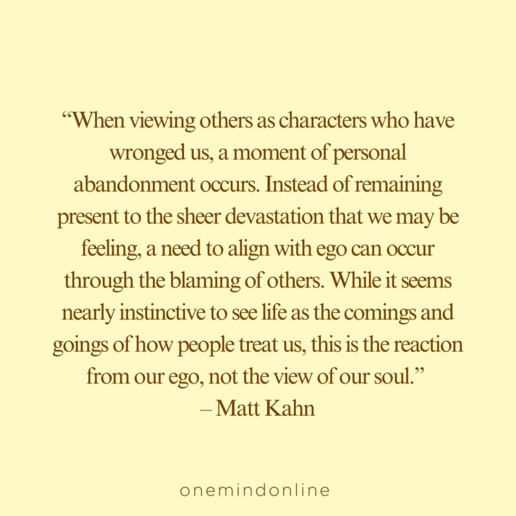“When viewing others as characters who have wronged us, a moment of personal abandonment occurs. Instead of remaining present to the sheer devastation that we may be feeling, a need to align with ego can occur through the blaming of others. While it seems nearly instinctive to see life as the comings and goings of how people treat us, this is the reaction from our ego, not the view of our soul.” – Matt Kahn