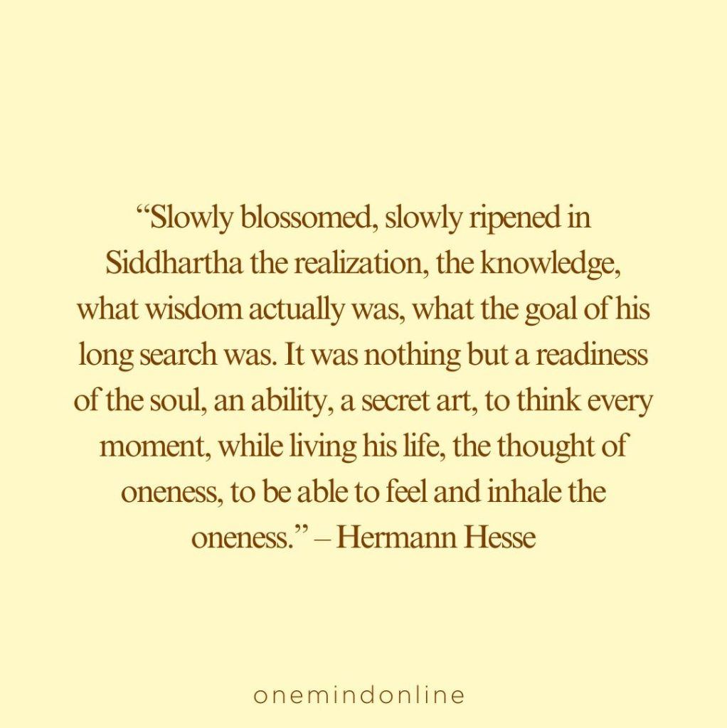 “Slowly blossomed, slowly ripened in Siddhartha the realization, the knowledge, what wisdom actually was, what the goal of his long search was. It was nothing but a readiness of the soul, an ability, a secret art, to think every moment, while living his life, the thought of oneness, to be able to feel and inhale the oneness.” – Hermann Hesse
