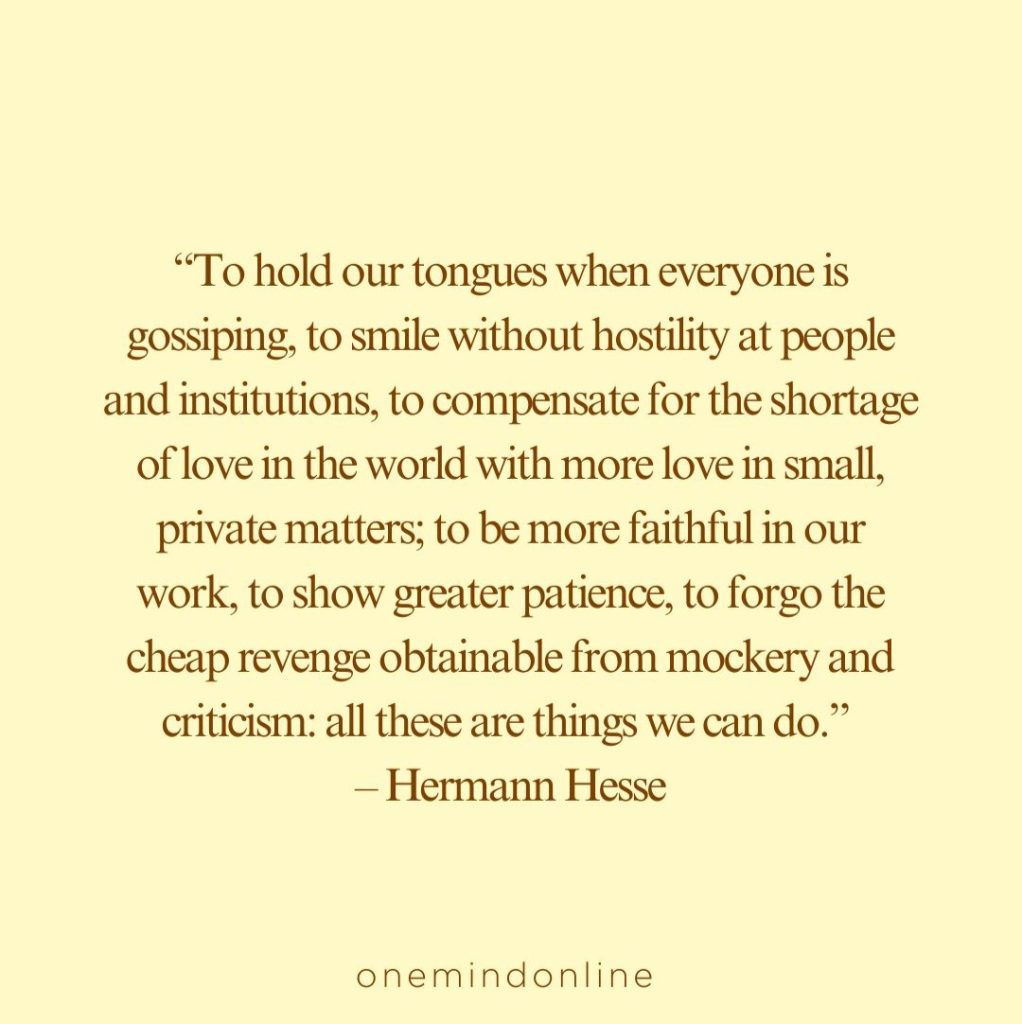“To hold our tongues when everyone is gossiping, to smile without hostility at people and institutions, to compensate for the shortage of love in the world with more love in small, private matters; to be more faithful in our work, to show greater patience, to forgo the cheap revenge obtainable from mockery and criticism: all these are things we can do.” – Hermann Hesse
