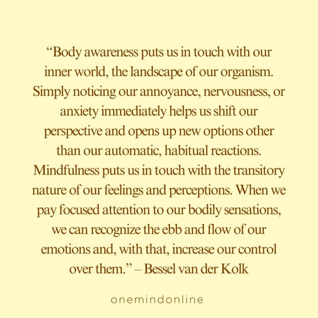 “Body awareness puts us in touch with our inner world, the landscape of our organism. Simply noticing our annoyance, nervousness, or anxiety immediately helps us shift our perspective and opens up new options other than our automatic, habitual reactions. Mindfulness puts us in touch with the transitory nature of our feelings and perceptions. When we pay focused attention to our bodily sensations, we can recognize the ebb and flow of our emotions and, with that, increase our control over them.” – Bessel van der Kolk