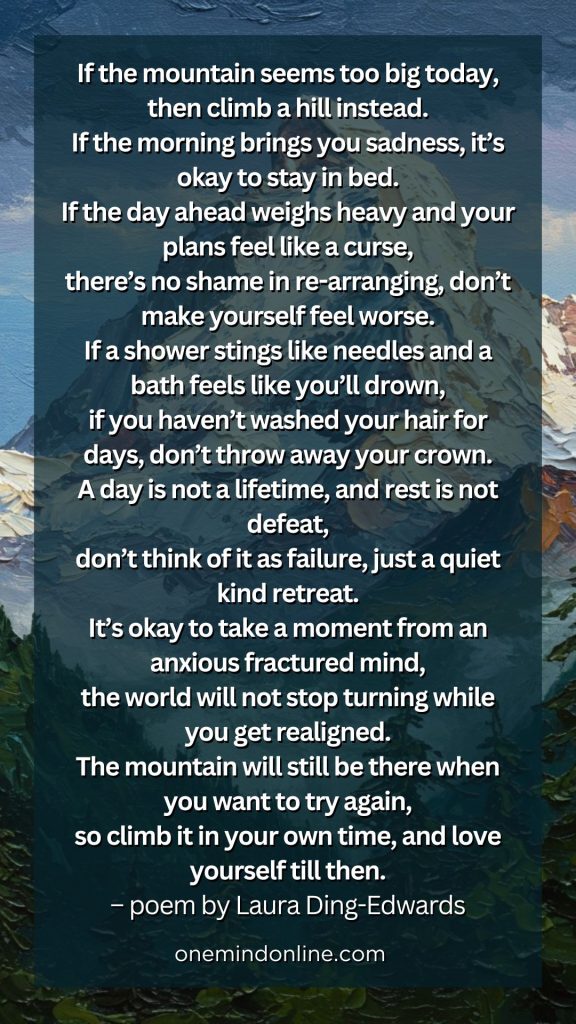 - Self-Compassion: Remember, you are not a machine. Cut yourself some slack when you need it. If a shower feels overwhelming, a bath feels suffocating, and your hair hasn’t seen shampoo in days – don’t “throw away your crown” (as the poem says). A day of rest doesn’t diminish your worth.