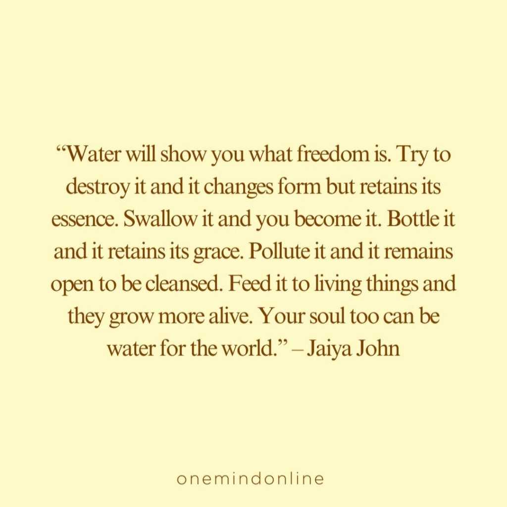 “Water will show you what freedom is. Try to destroy it and it changes form but retains its essence. Swallow it and you become it. Bottle it and it retains its grace. Pollute it and it remains open to be cleansed. Feed it to living things and they grow more alive. Your soul too can be water for the world.” – Jaiya John