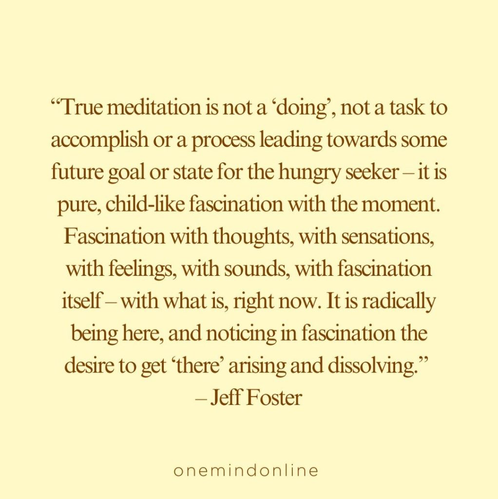 “True meditation is not a ‘doing’, not a task to accomplish or a process leading towards some future goal or state for the hungry seeker – it is pure, child-like fascination with the moment. Fascination with thoughts, with sensations, with feelings, with sounds, with fascination itself – with what is, right now. It is radically being here, and noticing in fascination the desire to get ‘there’ arising and dissolving.” – Jeff Foster
