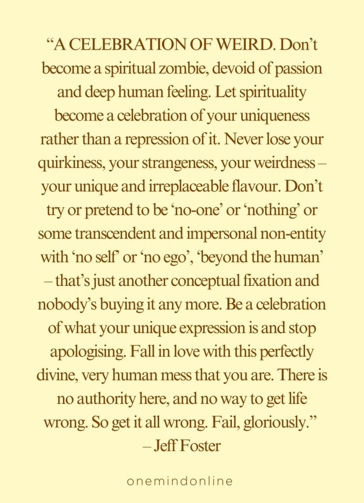 “A CELEBRATION OF WEIRD. Don’t become a spiritual zombie, devoid of passion and deep human feeling. Let spirituality become a celebration of your uniqueness rather than a repression of it. Never lose your quirkiness, your strangeness, your weirdness – your unique and irreplaceable flavour. Don’t try or pretend to be ‘no-one’ or ‘nothing’ or some transcendent and impersonal non-entity with ‘no self’ or ‘no ego’, ‘beyond the human’ – that’s just another conceptual fixation and nobody’s buying it any more. Be a celebration of what your unique expression is and stop apologising. Fall in love with this perfectly divine, very human mess that you are. There is no authority here, and no way to get life wrong. So get it all wrong. Fail, gloriously.” – Jeff Foster
