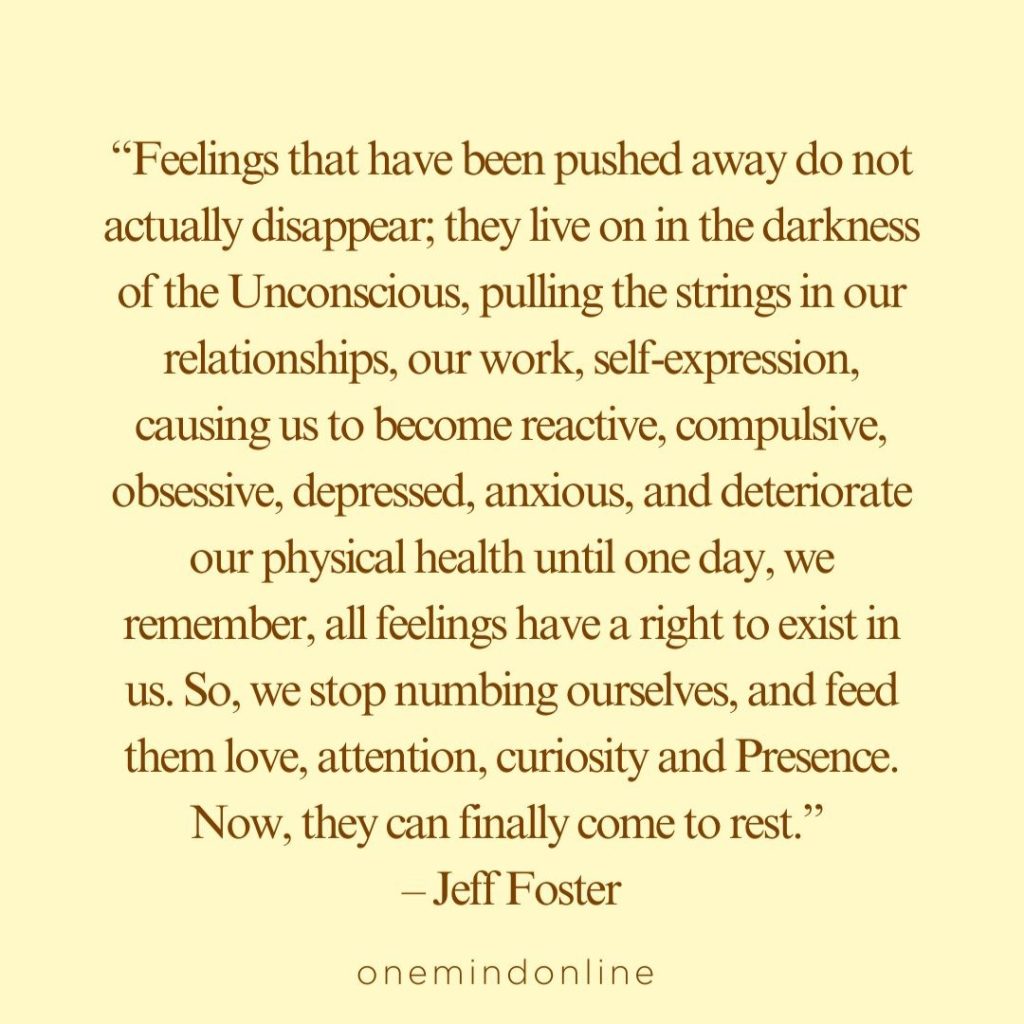 “Feelings that have been pushed away do not actually disappear; they live on in the darkness of the Unconscious, pulling the strings in our relationships, our work, self-expression, causing us to become reactive, compulsive, obsessive, depressed, anxious, and deteriorate our physical health until one day, we remember, all feelings have a right to exist in us. So, we stop numbing ourselves, and feed them love, attention, curiosity and Presence. Now, they can finally come to rest.” – Jeff Foster