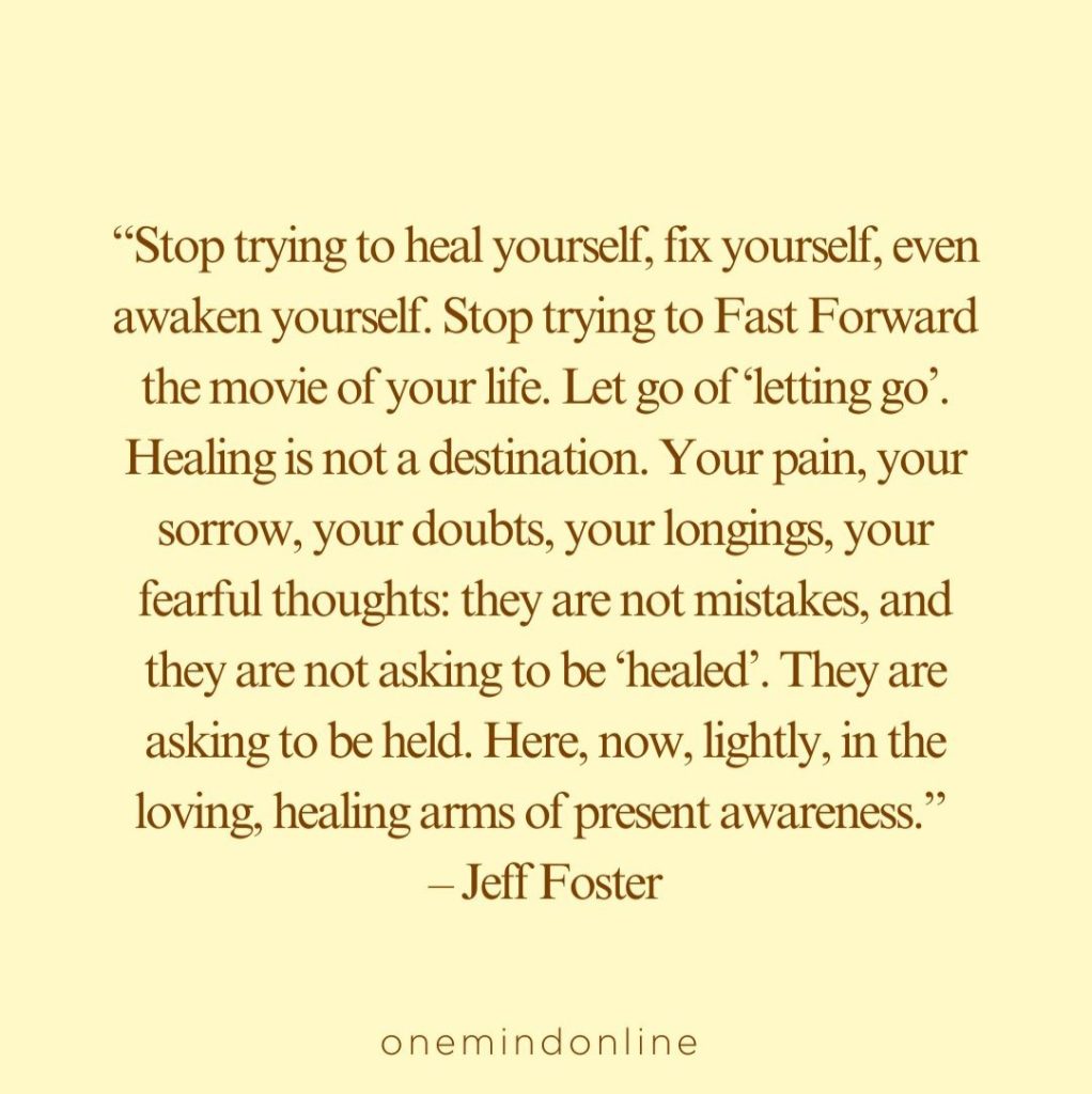 “Stop trying to heal yourself, fix yourself, even awaken yourself. Stop trying to Fast Forward the movie of your life. Let go of ‘letting go’. Healing is not a destination. Your pain, your sorrow, your doubts, your longings, your fearful thoughts: they are not mistakes, and they are not asking to be ‘healed’. They are asking to be held. Here, now, lightly, in the loving, healing arms of present awareness.” – Jeff Foster