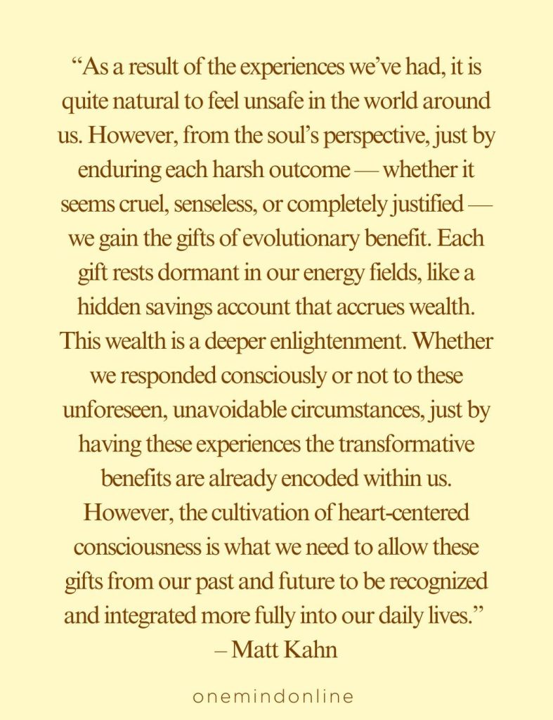 “As a result of the experiences we’ve had, it is quite natural to feel unsafe in the world around us. However, from the soul’s perspective, just by enduring each harsh outcome — whether it seems cruel, senseless, or completely justified — we gain the gifts of evolutionary benefit. Each gift rests dormant in our energy fields, like a hidden savings account that accrues wealth. This wealth is a deeper enlightenment. Whether we responded consciously or not to these unforeseen, unavoidable circumstances, just by having these experiences the transformative benefits are already encoded within us. However, the cultivation of heart-centered consciousness is what we need to allow these gifts from our past and future to be recognized and integrated more fully into our daily lives.” – Matt Kahn