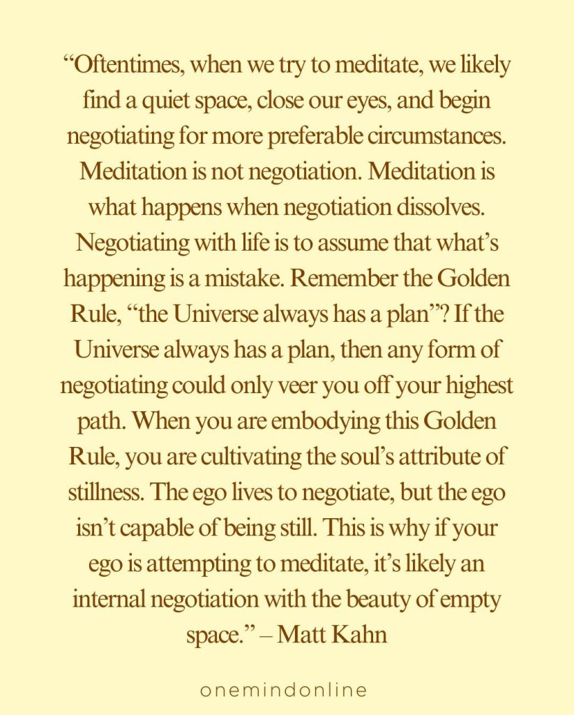 “Oftentimes, when we try to meditate, we likely find a quiet space, close our eyes, and begin negotiating for more preferable circumstances. Meditation is not negotiation. Meditation is what happens when negotiation dissolves. Negotiating with life is to assume that what’s happening is a mistake. Remember the Golden Rule, “the Universe always has a plan”? If the Universe always has a plan, then any form of negotiating could only veer you off your highest path. When you are embodying this Golden Rule, you are cultivating the soul’s attribute of stillness. The ego lives to negotiate, but the ego isn’t capable of being still. This is why if your ego is attempting to meditate, it’s likely an internal negotiation with the beauty of empty space.” – Matt Kahn