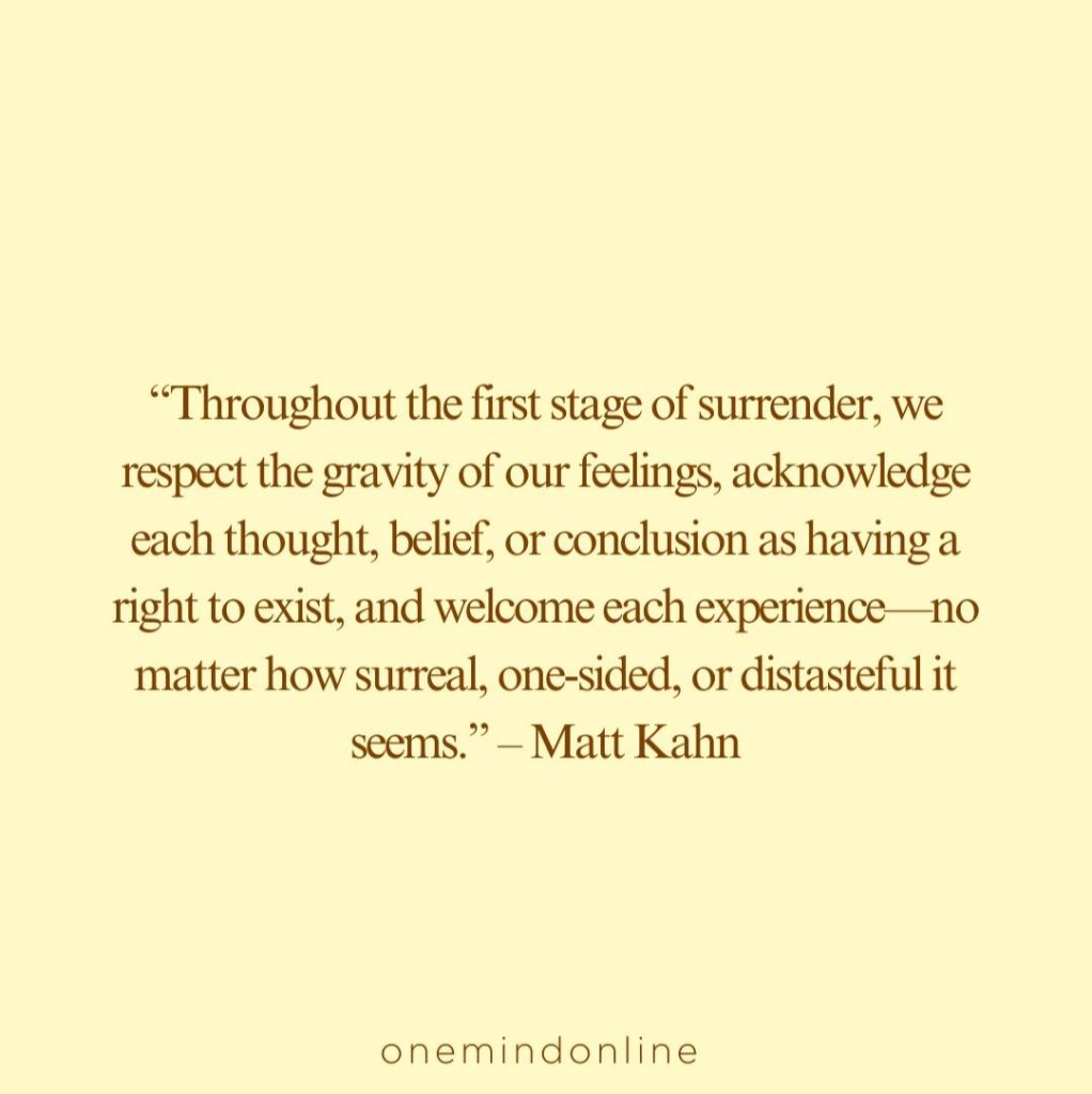 “Throughout the first stage of surrender, we respect the gravity of our feelings, acknowledge each thought, belief, or conclusion as having a right to exist, and welcome each experience—no matter how surreal, one-sided, or distasteful it seems.” – Matt Kahn