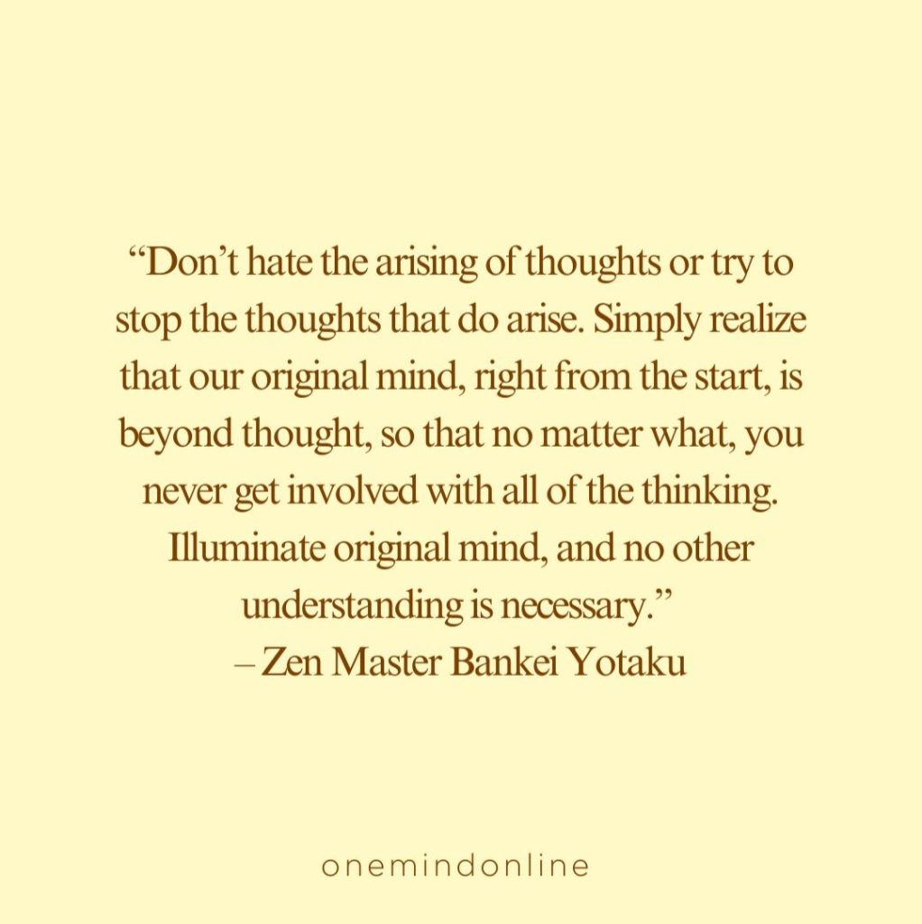 “Don’t hate the arising of thoughts or try to stop the thoughts that do arise. Simply realize that our original mind, right from the start, is beyond thought, so that no matter what, you never get involved with all of the thinking. Illuminate original mind, and no other understanding is necessary.” – Zen Master Bankei Yotaku