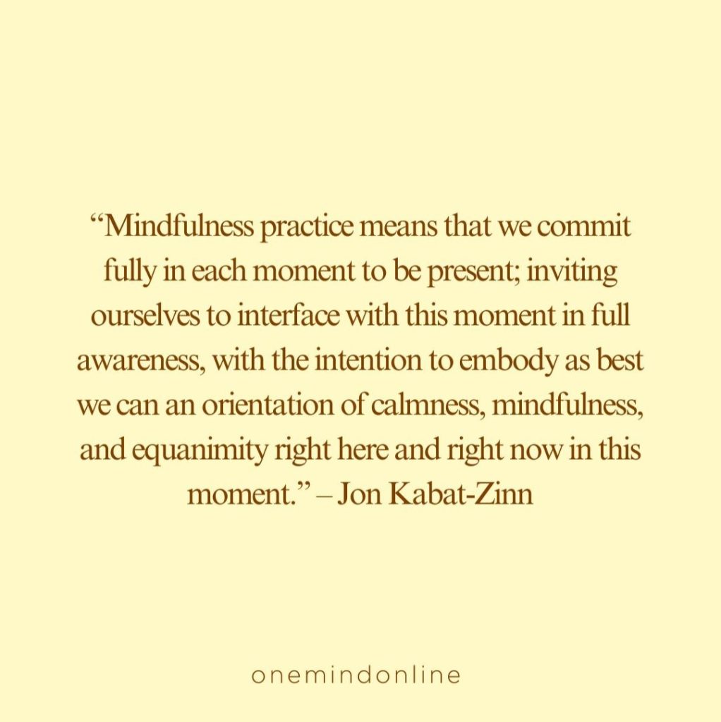 “Mindfulness practice means that we commit fully in each moment to be present; inviting ourselves to interface with this moment in full awareness, with the intention to embody as best we can an orientation of calmness, mindfulness, and equanimity right here and right now in this moment.” – Jon Kabat-Zinn