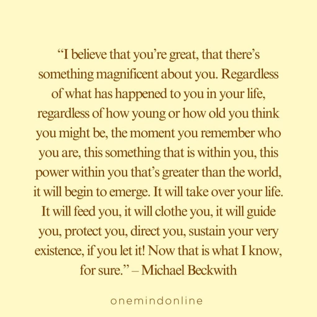 “I believe that you’re great, that there’s something magnificent about you. Regardless of what has happened to you in your life, regardless of how young or how old you think you might be, the moment you remember who you are, this something that is within you, this power within you that’s greater than the world, it will begin to emerge. It will take over your life. It will feed you, it will clothe you, it will guide you, protect you, direct you, sustain your very existence, if you let it! Now that is what I know, for sure.” – Michael Beckwith