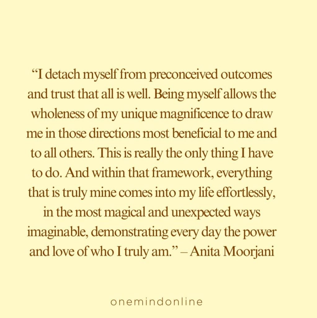 “I detach myself from preconceived outcomes and trust that all is well. Being myself allows the wholeness of my unique magnificence to draw me in those directions most beneficial to me and to all others. This is really the only thing I have to do. And within that framework, everything that is truly mine comes into my life effortlessly, in the most magical and unexpected ways imaginable, demonstrating every day the power and love of who I truly am.” – Anita Moorjani