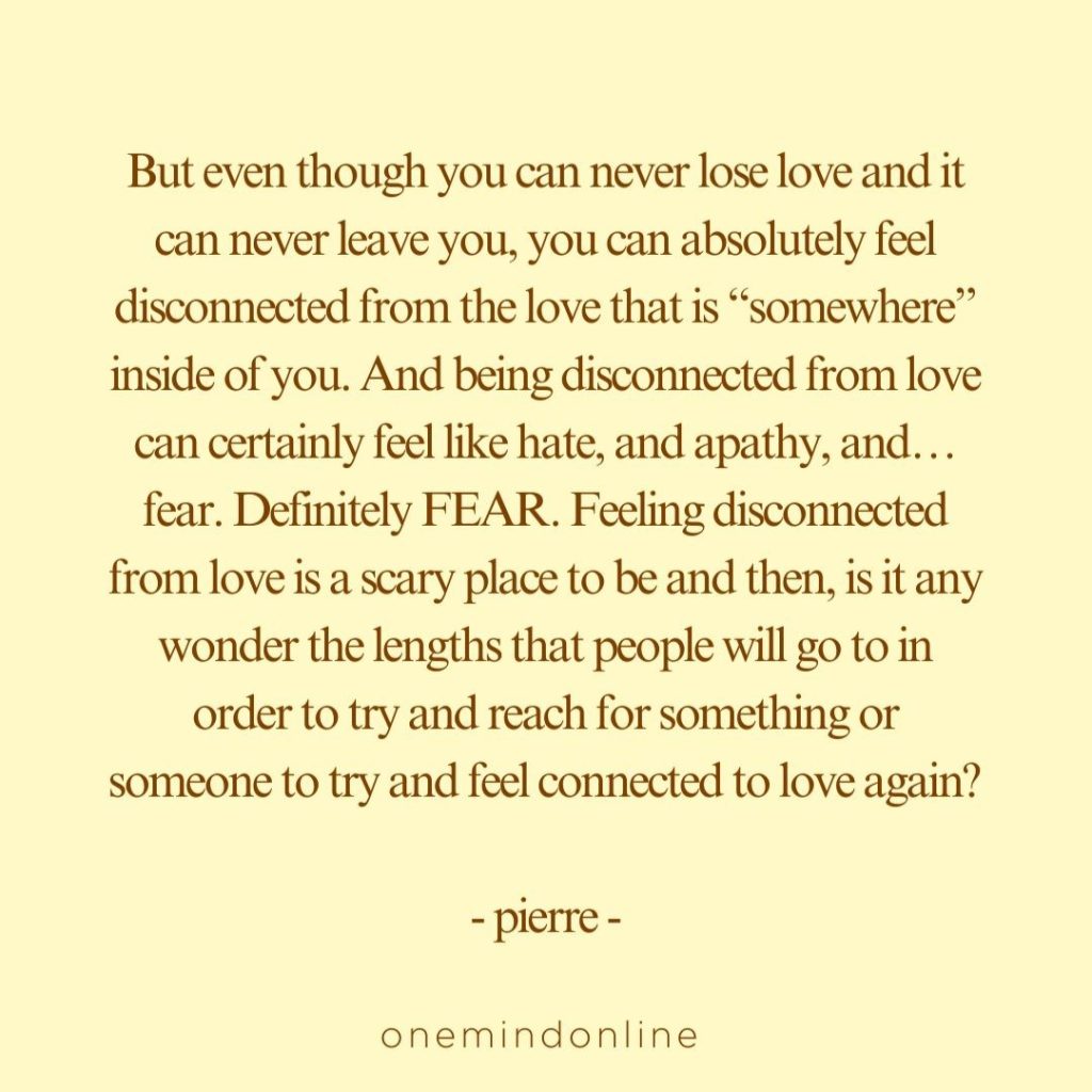 But even though you can never lose love and it can never leave you, you can absolutely feel disconnected from the love that is “somewhere” inside of you. And being disconnected from love can certainly feel like hate, and apathy, and… fear. Definitely FEAR. Feeling disconnected from love is a scary place to be and then, is it any wonder the lengths that people will go to in order to try and reach for something or someone to try and feel connected to love again? – pierre –
