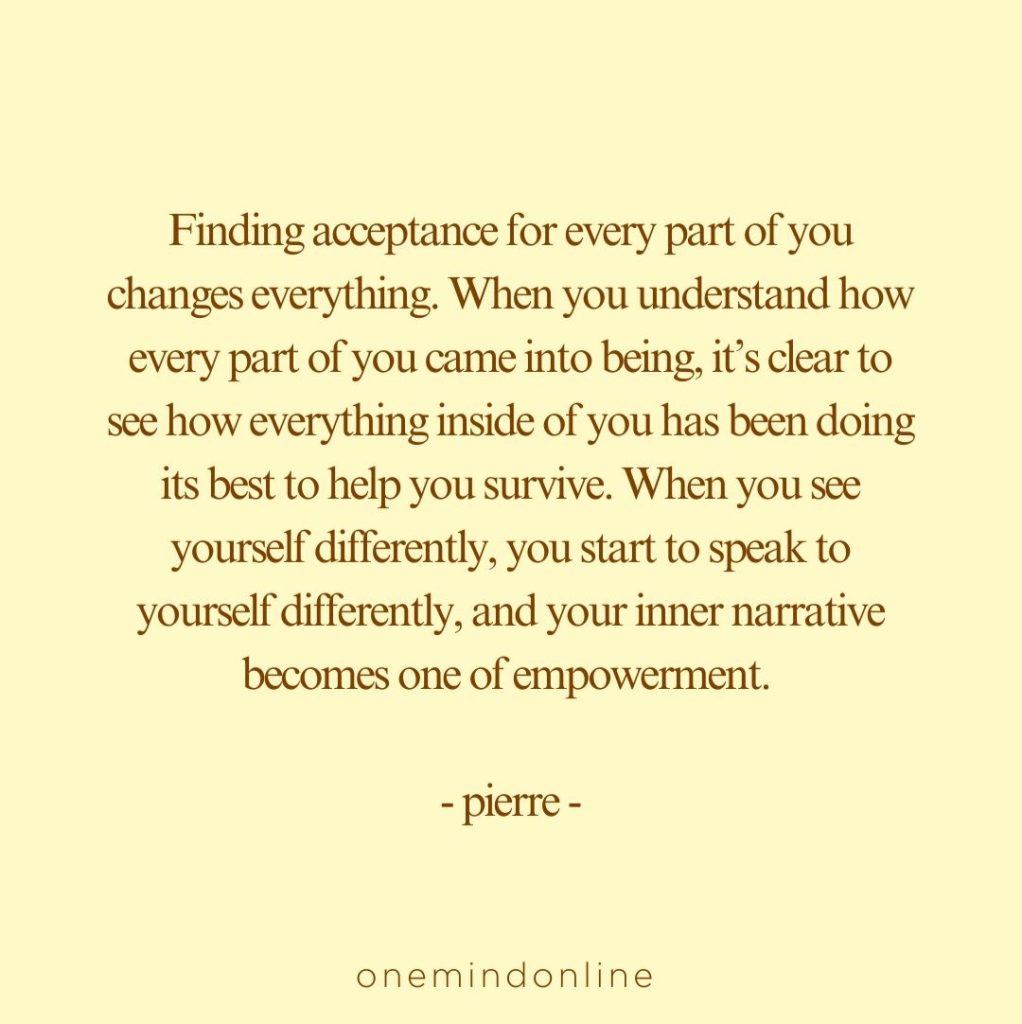 While you are rejecting any part of YOU, you will not be whole. PERIOD. The road to wholeness is through finding acceptance for every single part of you, especially the “worst” parts. Nothing inside of you is “bad”, every part of you has in some way just been trying SO hard to help you cope. – pierre –