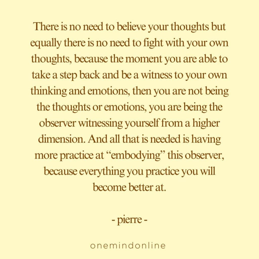 There is no need to believe your thoughts but equally there is no need to fight with your own thoughts, because the moment you are able to take a step back and be a witness to your own thinking and emotions, then you are not being the thoughts or emotions, you are being the observer witnessing yourself from a higher dimension. And all that is needed is having more practice at “embodying” this observer, because everything you practice you will become better at. – pierre –