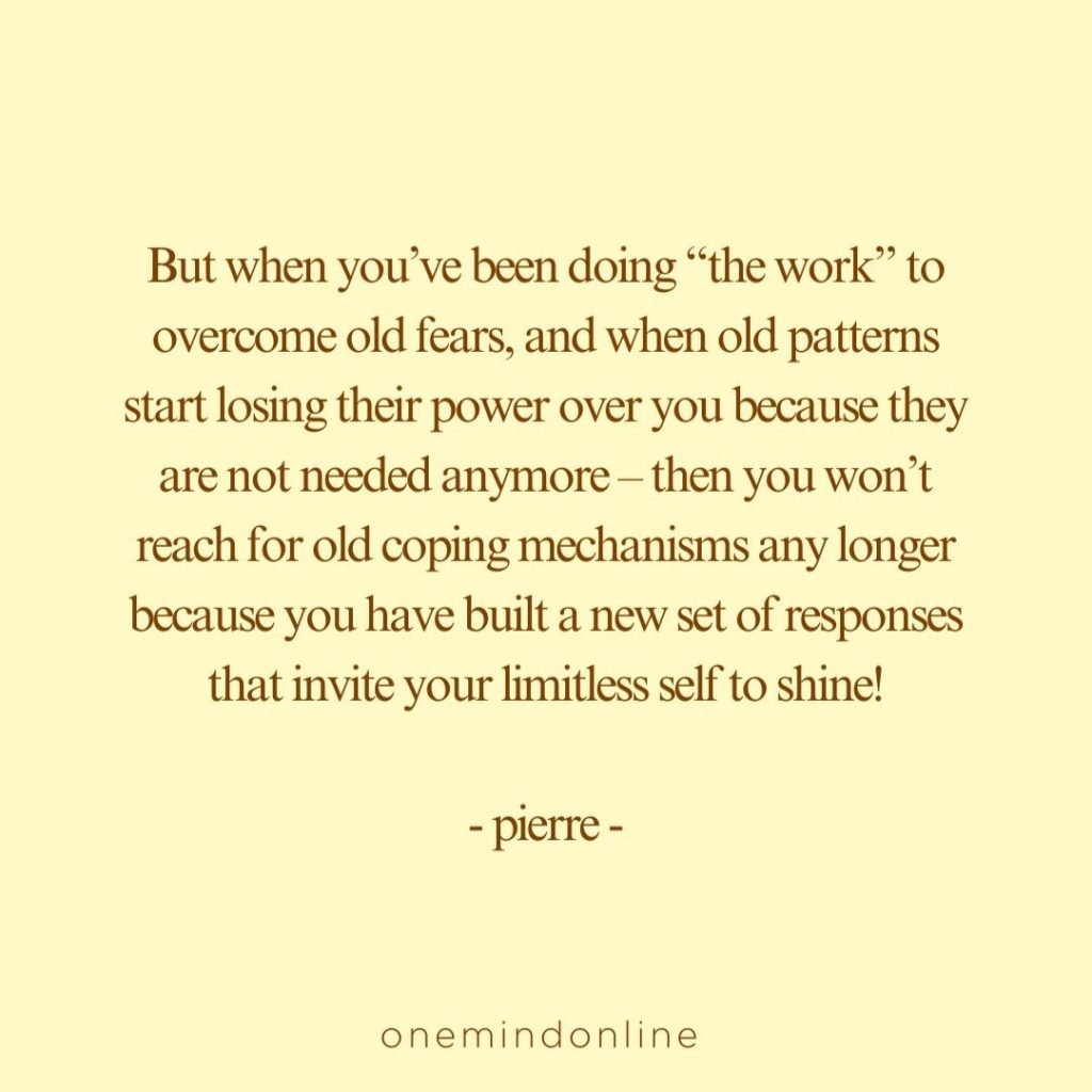 But when you’ve been doing “the work” to overcome old fears, and when old patterns start losing their power over you because they are not needed anymore – then you won’t reach for old coping mechanisms any longer because you have built a new set of responses that invite your limitless self to shine! – pierre –