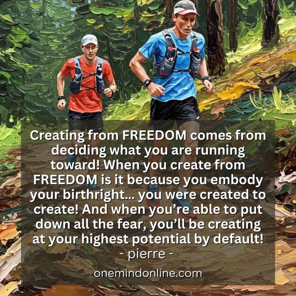 Creating from FREEDOM comes from deciding what you are running toward! When you create from FREEDOM is it because you embody your birthright… you were created to create! And when you’re able to put down all the fear, you’ll be creating at your highest potential by default! – pierre –