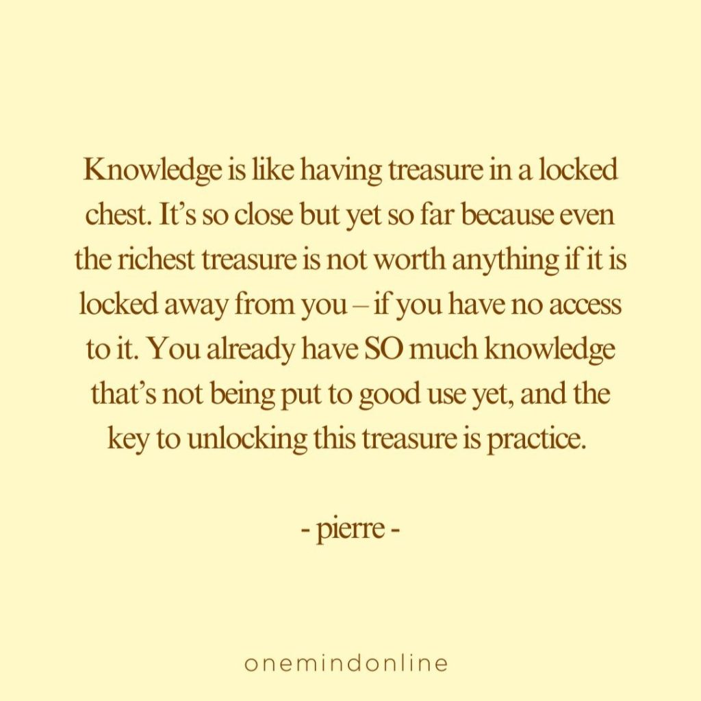 Knowledge is like having treasure in a locked chest. It’s so close but yet so far because even the richest treasure is not worth anything if it is locked away from you – if you have no access to it. You already have SO much knowledge that’s not being put to good use yet, and the key to unlocking this treasure is practice. – pierre –