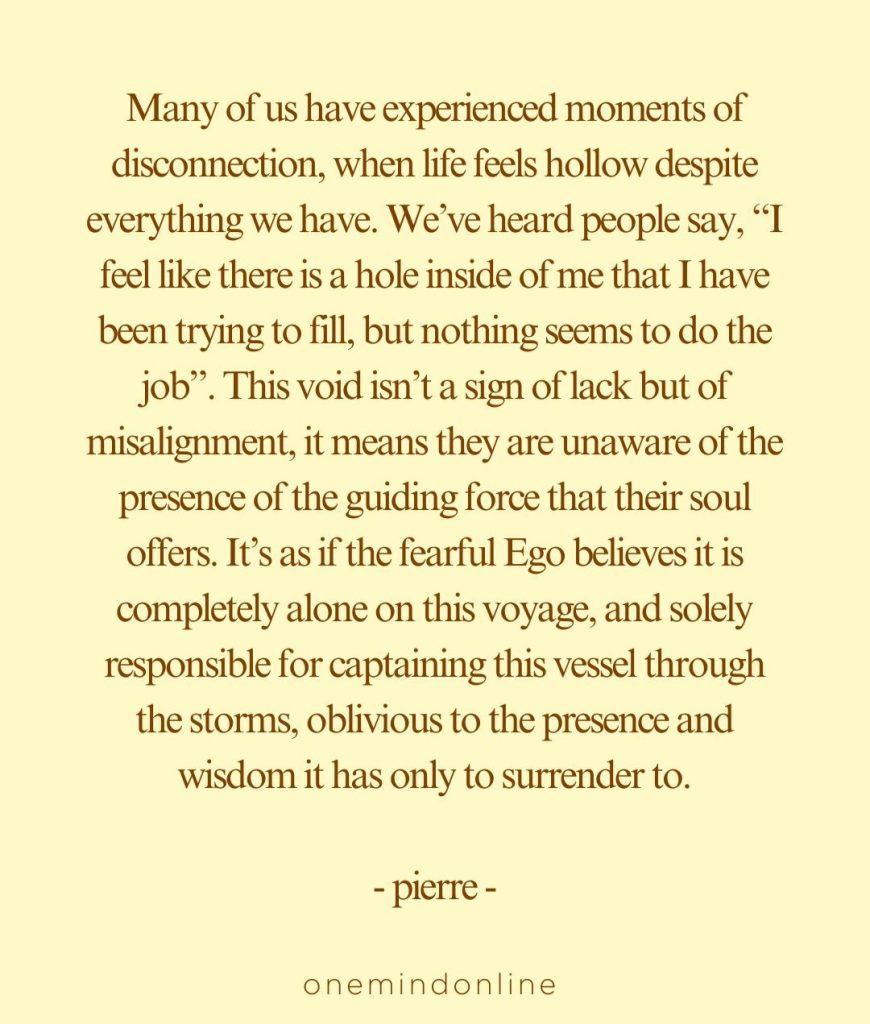 Many of us have experienced moments of disconnection, when life feels hollow despite everything we have. We’ve heard people say, “I feel like there is a hole inside of me that I have been trying to fill, but nothing seems to do the job”. This void isn’t a sign of lack but of misalignment, it means they are unaware of the presence of the guiding force that their soul offers. It’s as if the fearful Ego believes it is completely alone on this voyage, and solely responsible for captaining this vessel through the storms, oblivious to the presence and wisdom it has only to surrender to. – pierre –
