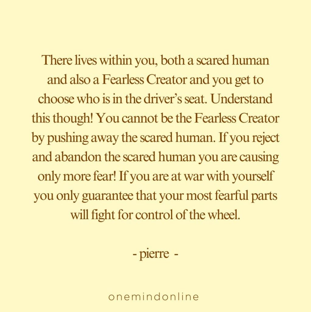 There lives within you, both a scared human and also a Fearless Creator and you get to choose who is in the driver’s seat. Understand this though! You cannot be the Fearless Creator by pushing away the scared human. If you reject and abandon the scared human you are causing only more fear! If you are at war with yourself you only guarantee that your most fearful parts will fight for control of the wheel. – pierre –