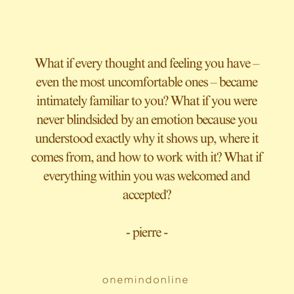 What if every thought and feeling you have – even the most uncomfortable ones – became intimately familiar to you? What if you were never blindsided by an emotion because you understood exactly why it shows up, where it comes from, and how to work with it? What if everything within you was welcomed and accepted? – pierre –