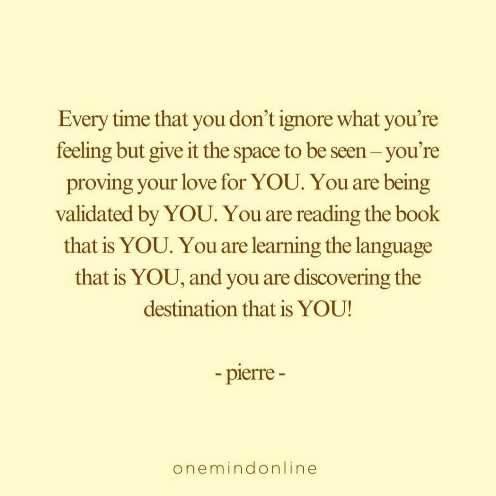 Every time that you don’t ignore what you’re feeling but give it the space to be seen – you’re proving your love for YOU. You are being validated by YOU. You are reading the book that is YOU. You are learning the language that is YOU, and you are discovering the destination that is YOU! – pierre –